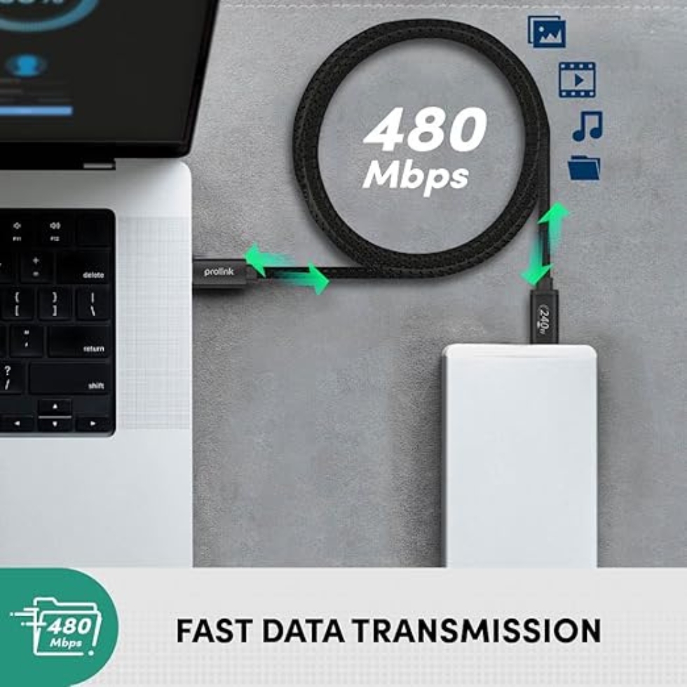 The GCC-240-02/2M/BLK Prolink 240W USB-C to C designed for fast charging and reliable data transfer. Supporting up to 240W Power Delivery and 480Mbps data speed, this cable ensures your devices are powered and synced efficiently. Equipped with an E-Mark chip, it provides enhanced safety, stable voltage, and intelligent device recognition, protecting your laptops, smartphones, and tablets during high-speed charging. Its durable design and 2-meter length make it ideal for home, office, or on-the-go use.