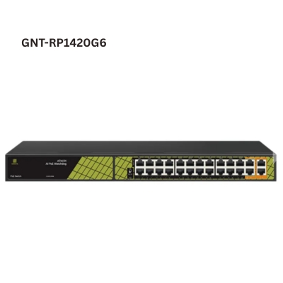 Featuring 16 PoE ports, 2 uplink ports, and 2 SFP fiber ports, the GNT-RP1420G6 delivers versatile connectivity while supporting 1000Mbps gigabit data transfer per port. Intelligent PoE management automatically allocates power, prevents overload, and ensures consistent performance for all connected devices.