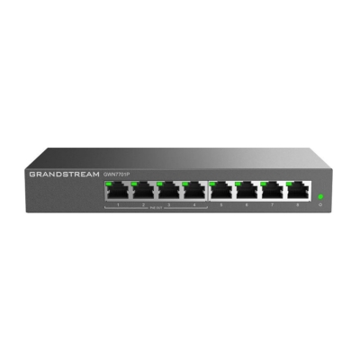 The Grandstream GWN7701P Unmanaged 8-Port PoE Switch is a cost-effective and reliable networking solution that combines Gigabit data transmission with Power over Ethernet (PoE) functionality. Featuring 4 PoE-enabled ports, it allows you to power devices such as IP cameras, VoIP phones, wireless access points, and IoT devices directly through Ethernet cables eliminating the need for additional power adapters.