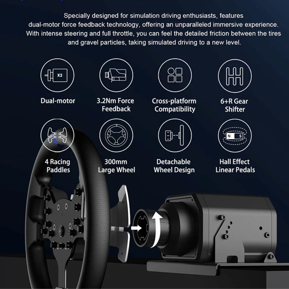 - Force Feedback: Strong 3.2Nm Dual-Motor (Gear-Driven) FFB for realistic road feel.