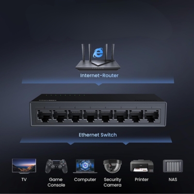 The UGREEN 8-Port Gigabit Ethernet Switch 35499EU is designed for seamless wired networking, delivering high-speed and stable connectivity across all devices. With 8 gigabit LAN ports, it provides ultra-fast data transfer, reliable performance, and plug-and-play simplicity. Its compact, energy-efficient design makes it ideal for home, office, and professional setups, supporting PCs, routers, gaming consoles, and media devices.