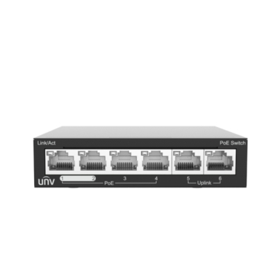The UNIVIEW 4+2 Port PoE Switch (NSW2020-6T-POE-IN) is a compact yet high-performance networking solution designed for small-scale surveillance, smart office setups, and IoT applications. Featuring 4 Power over Ethernet (PoE) ports and 2 uplink ports, this switch provides reliable power and data connectivity for IP cameras, wireless access points, and other PoE-enabled devices, simplifying network deployment while reducing cabling complexity.